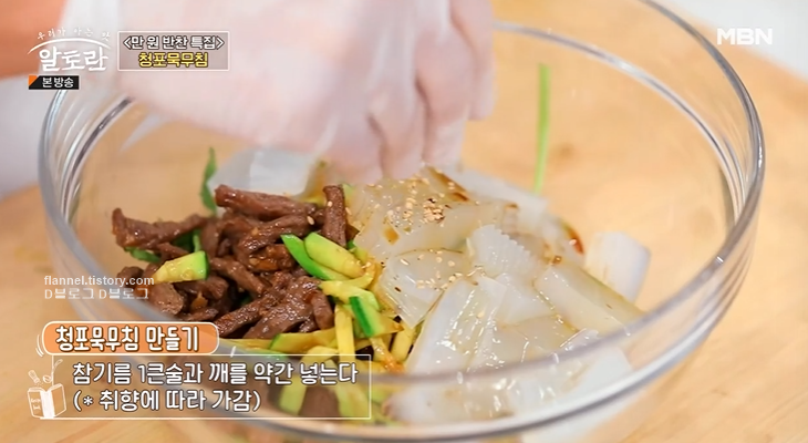 11. 간장 1큰술(묵 쪽에), 참기름 1큰술, 깨 약간 투하