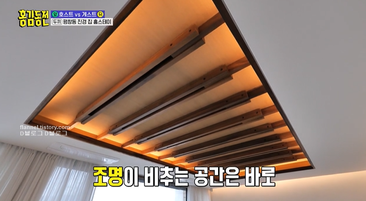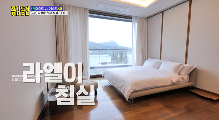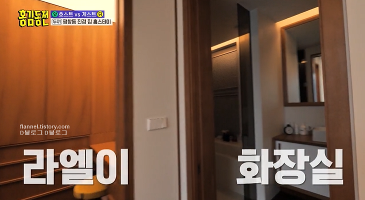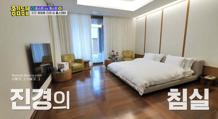 1층으로 내려가면 홍진경 침실이 나와요. 1층에 메인 현관이 있어요. 중문 스타일이 전통 양식 분위기네요.