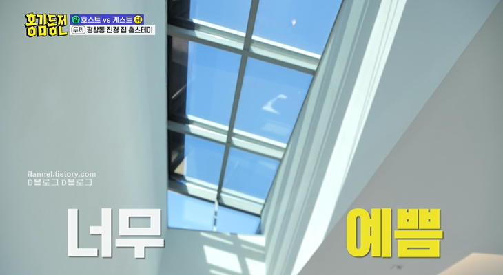 계단 옆에는 홍진경 작업실이 나와요. 그 옆은 홍진경 부부의 침실. 집이 전체적으로 깔끔하네요. 안방 침실에서 창문을 열고 나가면 정갈한 마당이 나와요. 밤에 조명이 켜지면 또 다른 분위기를 풍기네요.