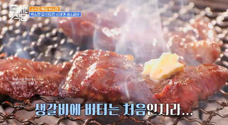 이 식당만의 특이점이 있다면 바로 버터예요. 생갈비 본연의 맛을 즐긴 뒤 남은 고기 한쪽 면에 버터를 올려 녹여 먹는 것. 스테이크가 아닌 생갈비에 올려 먹는 건 정말 독특하네요. 느끼할 것 같은데 전혀 그렇지 않대요. 박소현 말로는 미국맛이난다고.