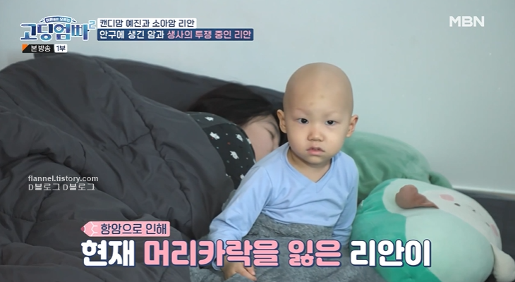 예진 집은 의정부에 위치하고 있어요. 원룸에서 살고 있네요. 아들이 머리카락이 없어서 의아했는데 현재 항암치료를 받고 있대요. 한쪽 눈 동공 정 가운데가 반짝거려서 안과를 갔는데 대학병원을 가보라는 충격적인 소식을 들었다고.. 올해 3월 리안은 소아암 판정을 받았어요. 종양 크기도 크고 위치가 안 좋아서, 안구를 제거하거나 항암치료를 하거나 선택해야 했다고..