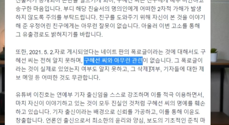 구혜선 변호사 측은 이진호 방송에 대해, 구혜선은 진술서 원본을 소지하고 있고 떠돌고 있는 캡처본 출처나 입수경로는 알 수 없다고 밝혔어요. 하지만 원본 내용과 일치한다고 했네요. 고소인의 오랜 친구는 법정 출석해 증언까지 해줄 수 있다고 하여 작성된 글이지만, 비공개 조정으로 합의 이혼해 소송이 종결됐기 때문에 서명 날인할 기회를 갖지 못했대요. 무엇보다 친구 이름이 공개돼 구혜선은 매우 미안해하고 있대요.