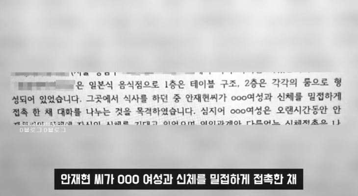 안재현과 서현진은 드라마 '뷰티인사이드'에 함께 출연한 바 있죠. 당시 DVD 제작 후반 작업 녹음 일에 주연 배우 6명이 모였고, D 일식집에서 저녁 식사 자리를 가졌어요. 그때 안재현은 당시 출연 여배우 B 씨와 신체를 밀접하게 접촉한 채 대화를 나누었대요. 그걸 서현진이 목격했다는 것. 서현진뿐만 아니라 현장에 있던 여러 명의 사람들이 그걸 동시에 목격했대요. 잠시 후 두 사람은 손을 잡고 비워진 다른 룸으로 이동했다네요. 그 룸까지 따라가서 '여기서 뭐하냐'라고 묻자 두 사람은 재빨리 자리를 떠났다네요. 마지막으로 '2020년 4월 8일 서현진'이라는 내용이 명시돼 있어요.