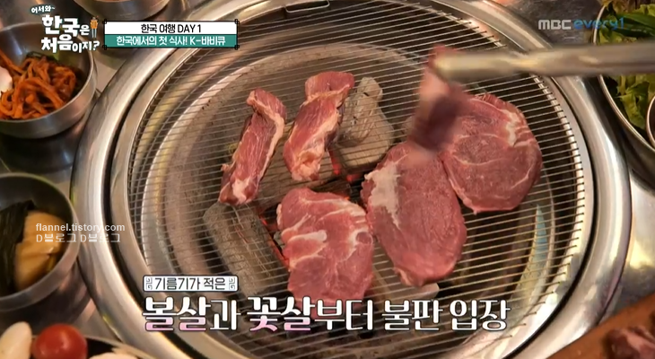 목살, 꽃살, 꼬들살, 볼살, 항정상이 모두 모인 모듬 고기가 나왔어요. 사실 세 친구들은 한국 도착하고 앉으나 서나 K바비큐 얘기만 했거든요ㅋㅋㅋ 어찌나 귀엽던지! 먹어도 된다는 데이비드 말에 무섭게 달려드는 친구들ㅋㅋㅋ 모두들 맛있다며 고개를 끄덕이네요.