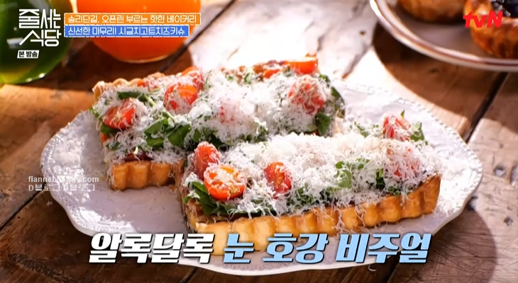 마지막 메뉴는 시금치고트치즈키슈! 신선한 토마토에 촉촉한 달걀, 베이컨, 루콜라까지 더해졌어요. 샐러드 같이 산뜻하고 마무리하기 너무 좋은 메뉴라고.