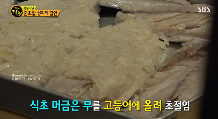 피조개 껍데기, 식초, 모과를 그대로 흡수한 무가 핵심 재료예요. 무를 고등어에 올려 초절임 하네요. 이 방법은 혁신적인 방법이래요. 왜냐하면 식초를 생선살에 부으면 하얗게 굳어버리기 때문이라네요. 그런데 무 자체에 식초를 가미해서 숙성시키면 더 장시간 갈 수 있대요. 청어 또한 같은 방식으로 초절임 한대요.
