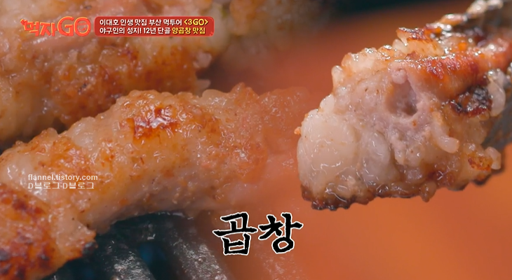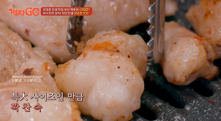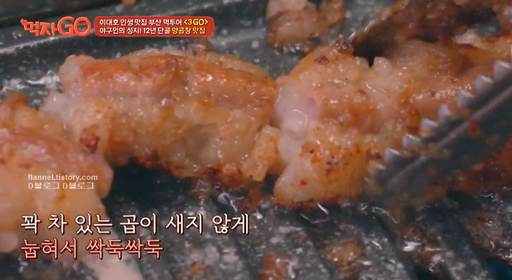 곱창은 초벌해서 나오는데 겉바속촉 탱글탱글하네요. 다른 집에 비해 지방을 그대로 살려 고소함이 두 배래요. 김국진은 느끼함이 맛있다고 처음 느껴봤다고 해요. 그만큼 맛있나 봐요!
