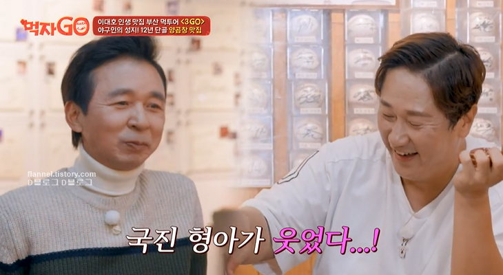 주문한 대창 등장. 특대 사이즈인만큼 속이 꽉 찼어요. 김국진이 먹고 좋아하니까 이대호가 엄청 뿌듯해하네요ㅋㅋㅋ 대창이 정말 고소하대요.