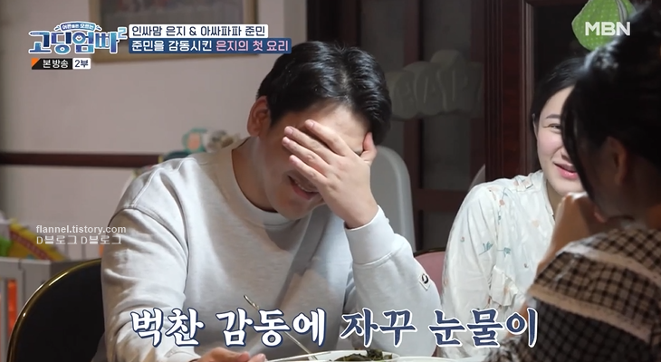 그러면서 미역국 끓이기에도 도전했어요. 남편은 그런 은지에게 고마운 듯 먹다가 울기까지 하네요.