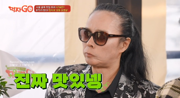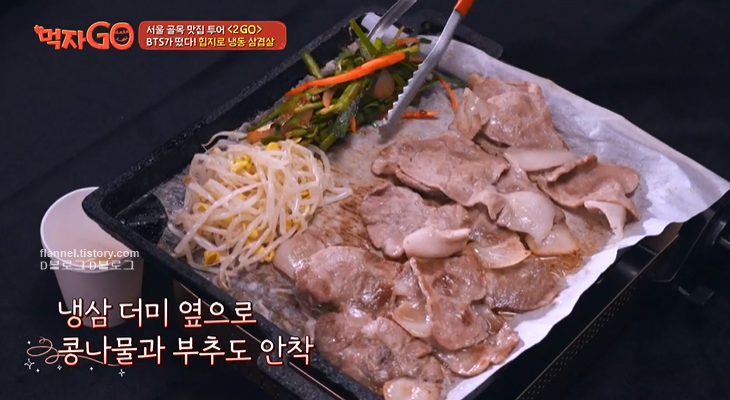 사장님이 고기 굽는 팁을 줬는데, 고기를 불판 가득 올려 구우래요. 고기끼리 살짝 겹쳐도 괜찮대요. 냉삼 옆에는 콩나물, 부추도 올리기. 소식남 김태원도 맛에 반했네요. 일반 삼겹살과는 확실히 다른 맛!
