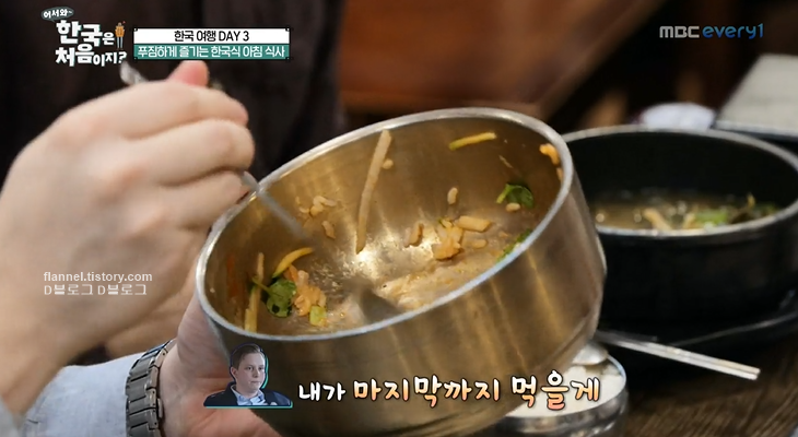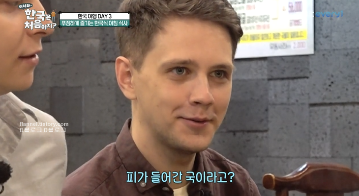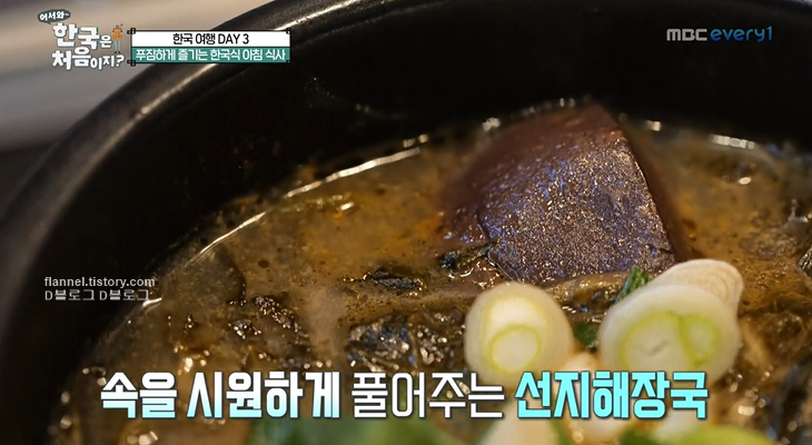 '어서와 한국은 처음이지' 스웨덴 편이 전해졌어요. 아침부터 잠들기까지 끊임없는 먹방을 선보여 놀라움을 안겼는데요. 이번엔 아침부터 또 푸짐한 식사를 즐겼더라고요. 메뉴는 속을 시원하게 풀어주는 선지해장국과 신선한 육회비빔밥, 달콤한 불고기예요. 1인 1 선짓국에 푸짐한 메뉴 두 가지도 더 주문했네요. 하지만 선짓국이 소의 피로 만들어졌다는 말에 친구들 동공지진ㅋㅋㅋ 하지만 스웨덴에도 피로 만든 '블러드푸딩'이라는 게 있대요. 비주얼은 비슷한데 데이비드 말로는 한국 선지가 더 맛있대요. 다행히 친구들도 거부감 없이 먹네요.