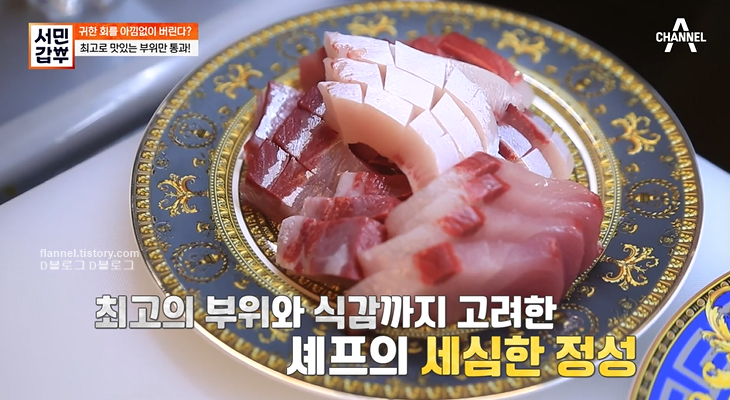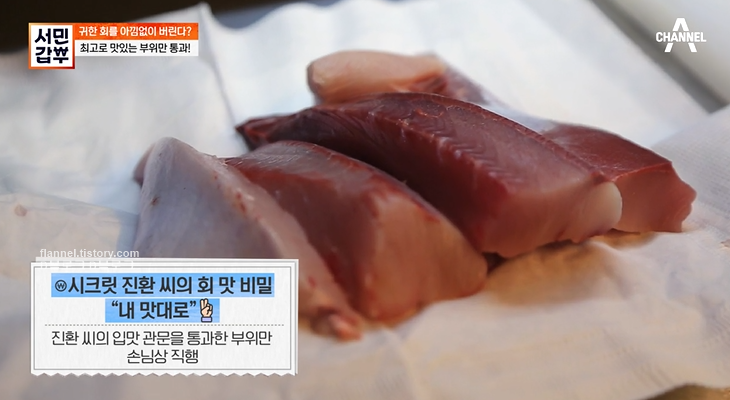 특이한 게 이진환은 얇고 납작한 생선을 가로가 아닌, 세로로 썰어 회로 만들더라고요. 고객 취향에 맞게 여자 손님은 회를 좀 작게, 남자 손님에게는 크게 썰어 준비한대요. 손님이 회를 먹는데 최대한 불편함 없게 하려 한다고. 또한 생선의 모든 부위를 사용하지 않고 거의 절반은 버려버리더라고요. 깐깐한 이진환의 입맛을 통과한 부위만 손님상에 올라갈 수 있대요.