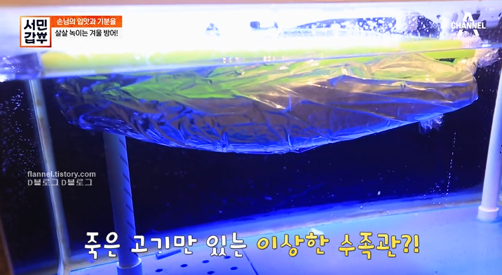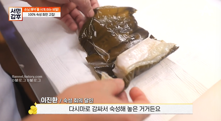 또한 이상한 게 식당 수족관에는 죽은 고기가 떠있더라고요. 이 방법이 산소와의 접촉이 최대한 없기 때문에 회를 숙성하는데 많은 도움이 된대요. 다시마로 회를 감싸서 숙성하는 것도 특이한데, 이진환은 이렇게 감칠맛이 최고조로 올라간 100% 숙성회만 대접한대요.
