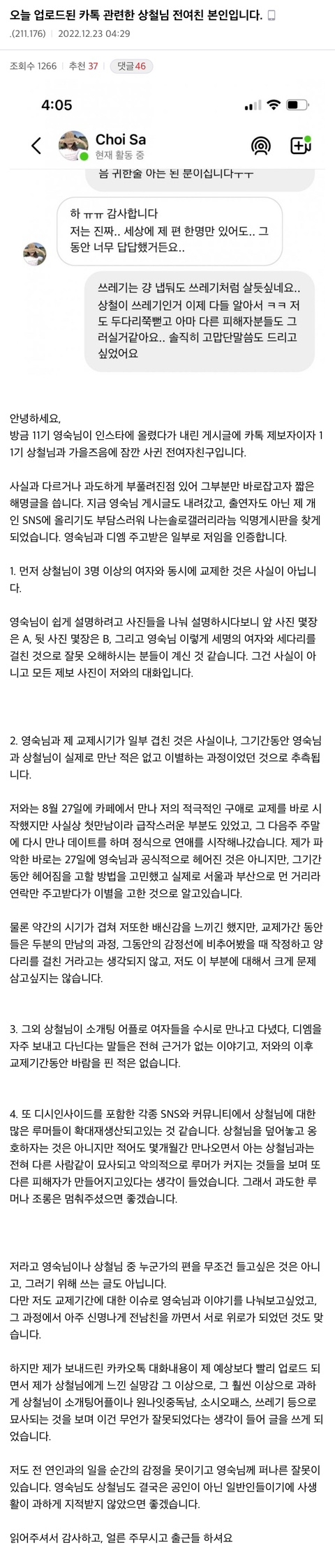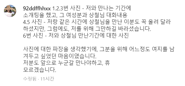 그런데 영숙 폭로 이후 영숙에게 제보했던 상철 전 여자 친구가 해명하고 나섰어요. 상철과 가을에 잠깐 사귀었다고 하는데요. 부풀려진 점이 있어 '나는 솔로 갤러리'를 통해 제보하게 됐대요. 상철도 나름의 입장이 있는 거 같네요.