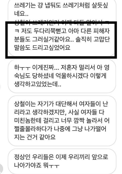 하지만 더 큰 문제는 영숙이 인스타를 통해 털어놓은 충격적인 사실이에요. 연애하는 동안 상철은 소개팅 어플을 통해 다른 여자들과 만남을 가져왔다고 하는데요. 영숙은 그 증거로 당시 여자들이 상철과 주고받았던 카톡 메시지창을 첨부했어요.