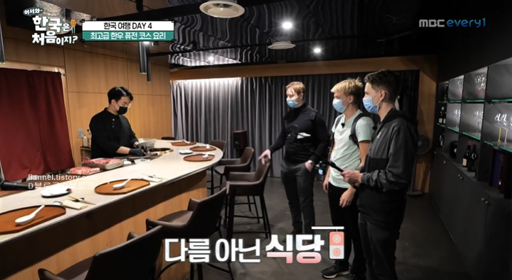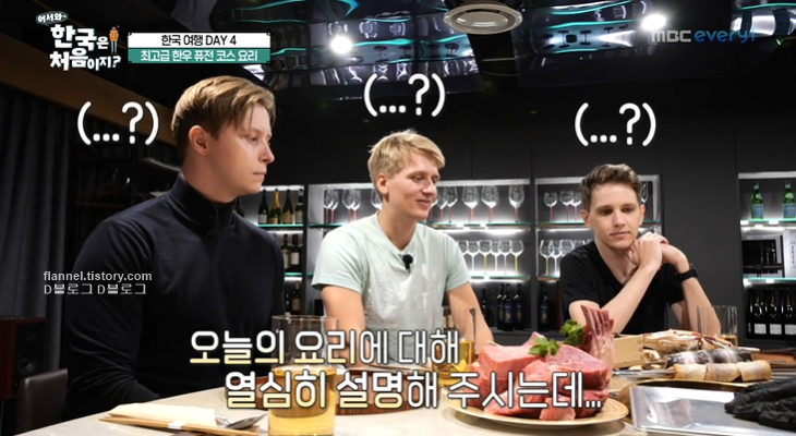 '어서와 한국은 처음이지' 강남 한우 퓨전 식당이 전해졌어요. 입구에 들어서자마자 친구들은 고급스러운 식당 분위기에 눈을 떼지 못했는데요. 그도 그럴 것이 한눈에 봐도 싱싱한 한우 비주얼! 이 식당의 정체는 최고급 한우 퓨전 코스 요리 전문점이에요. 고기는 모두 BMS(마블링을 나타내는 척도로써 숫자가 높을수록 등급이 우수, 7~9 등급은 1++ 등급에 해당)로 준비돼요. 셰프가 한국말로 엄청 열심히 설명하는데 친구들은 어리둥절ㅋㅋㅋ