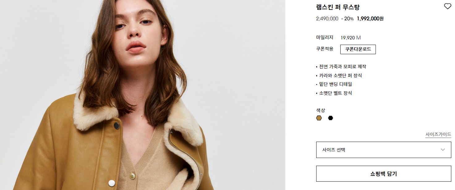 김지민 무스탕 브랜드는 '마쥬' 제품이에요. 상품 가격은 '램스킨 퍼 무스탕'. 가격은 현재 홈페이지에서 199만 원에 판매되고 있네요. 천연 가죽과 모피로 제작됐고, 내부 전체가 퍼 안감으로 따뜻하대요.ㅊ
