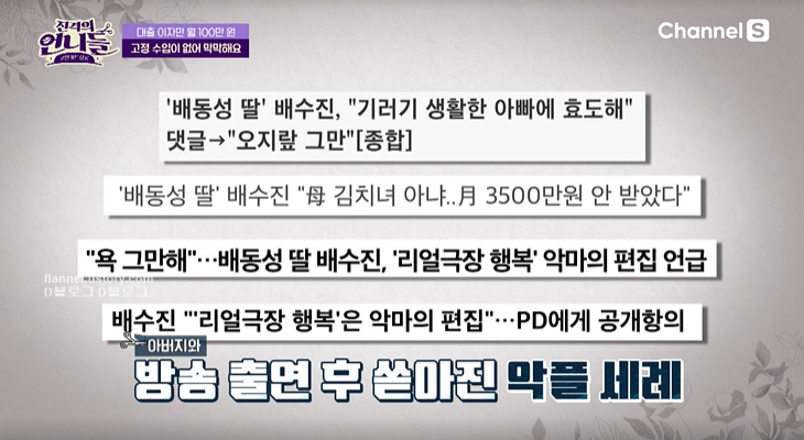사실 배수진은 배동성 딸로 처음 예능을 출연했어요. 그때 금수저, 철없는 딸로 이미지가 각인돼 지금까지도 욕을 먹고 있다고 하네요. 이야기를 듣던 박미선은 금수저 맞다며 팩폭ㅋㅋㅋ 유년 시절에는 돈걱정 없이 유복하게 살지 않았냐며, 27살이 됐으면 내가 잘할 수 있는 일을 먼저 찾아보라고 조언하네요. 더 절실한 사람도 많다고.
