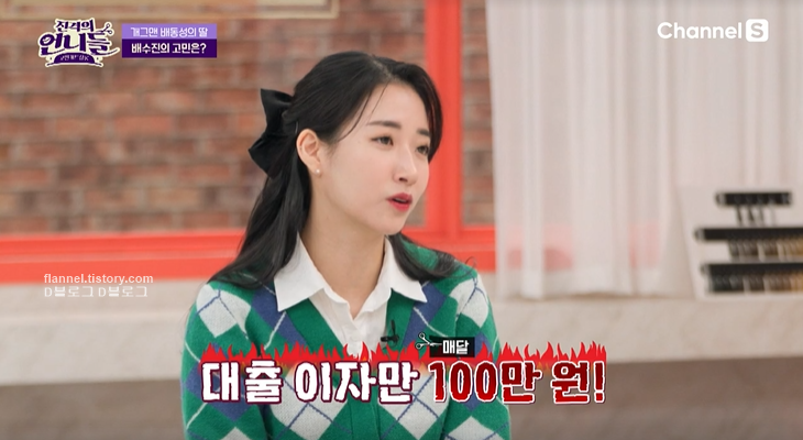 '진격의 언니들'에 방송인 배수진이 출연했어요. 배수진은 배동성 딸로 알려져 있죠. 이날 배수진은 고민을 묻자 한 달 대출 이자만 100만 원이 나가고 있다며 "고정적인 수입이 나올 직업이 없어서 어떤 일을 해야 할지 고민이에요"라고 답했어요. 올해 2월에 경기도 집을 사느라 대출을 받았다고 하네요. 이혼하고 이사를 너무 많이 다녀서 아들과 안정적으로 정착하고 싶었대요.