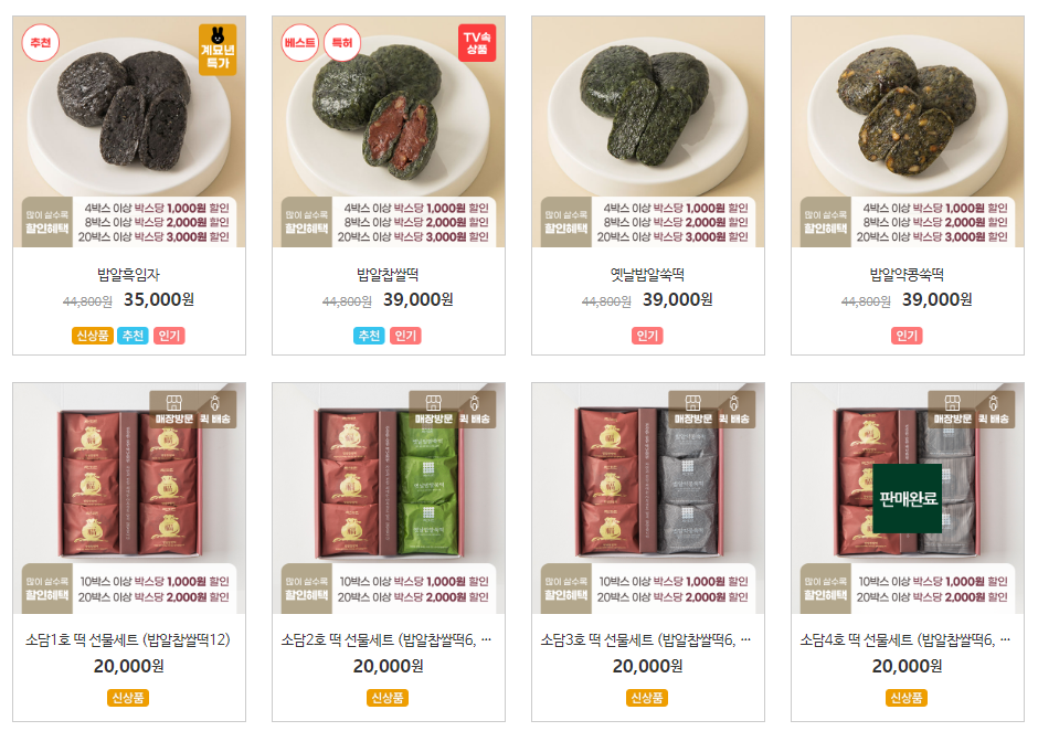 해당 상품은 국내산 제품들로 만들어진, 쌀가루와 글루텐이 들어가지 않은 건강한 간식이에요. 서울 강동구에 매장도 있어서 직접 방문해서 수령할 수도 있어요. 브랜드 이름은 '백년화편'으로 가격은 한 박스 32개 3만 9천 원이에요. 12개 든 건 2만 원이에요. 흑임자, 쑥떡, 콩쑥떡 등 종류도 다양하네요. 설날 명절 선물로도 좋을 듯.