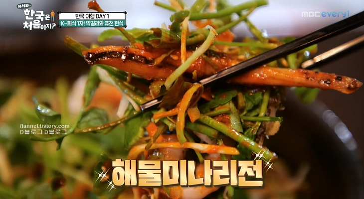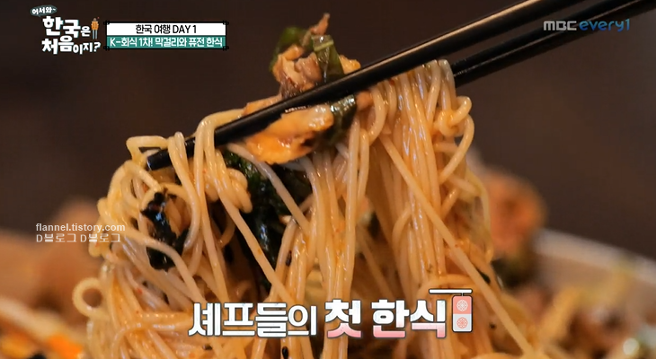 그리고 고대하던 음식 등장. 꼬막도토리묵무침인데 생소한 비주얼이네요. 무쳐서 먹어야 하는데 하나하나 맛보는 셰프들 역시ㅋㅋㅋ 깻잎은 이탈리아에 없는 새로운 향이라고 해요. 그래서 더 신기해하더라고요. 맛도 무척 마음에 든다고.