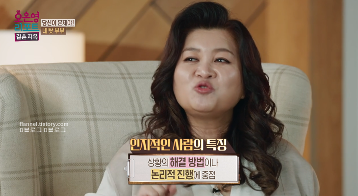 오은영은 남편과 시댁이 모두 인지적인 사람인 것 같대요. 인지적인 사람 특징은 상황의 해결 방법이나 논리적 진행에 중점을 둔대요. 정서적인 사람과 반대인 셈. 첫눈이 오면 '예쁘다'가 아니라 '사람 많은 델 왜 가'라고 말하는 사람이에요. 당연히 대화 과정에서 느끼는 감정을 덜 고려한다고. 반면 아내는 굉장히 정서적인 사람이래요. 그래서 균형을 맞춰서 접점을 찾는 게 중요하다고.