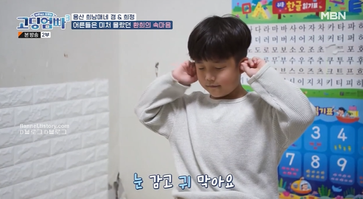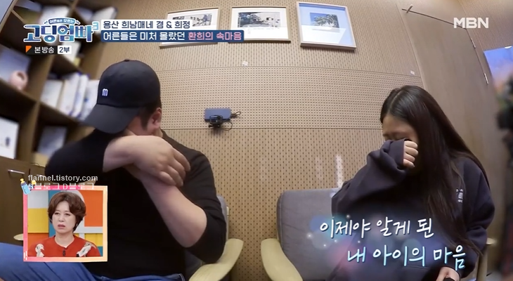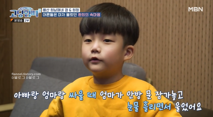 이를 지켜보던 제작진이 정신건강의학과 검사를 준비했어요. 김겸은 감정적 어려움을 겪는 정도가 심각한 수준이래요. 우울과 불안이 평균 이상이라고. 환희 또한 부정적 감정을 느끼고 있더라고요. 엄마가 아빠랑 싸우고 우는 것도 마음에 담아 두고 있더라고요. 횟수까지 기억해내면서 "머릿속에 그 생각이 있어요. 겁났어요" "그래서 어떻게 했어?" "눈 감고 귀 막아요. 그러면 소리가 안 들려요"