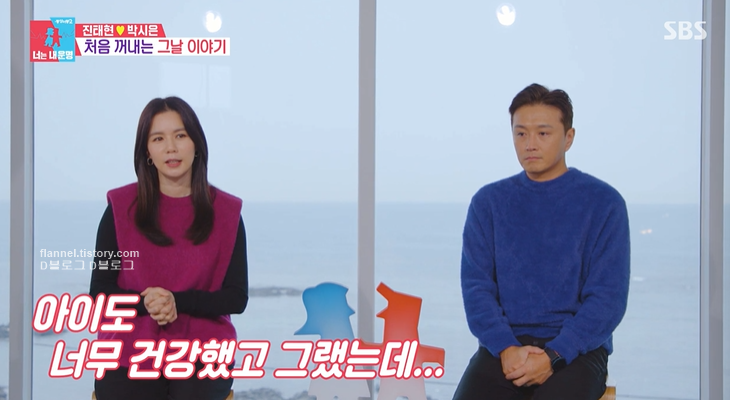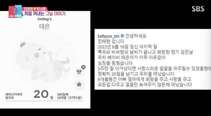 박시은은 아기 태은이를 9개월 동안 품었어요. 아이도 너무 건강했다고 하네요. 하지만 정기검진을 갔다가 아이 심장이 멈춰있는 걸 알았대요. 이유는 알 수 없다고.. 검사 당일 수술을 해서 아이를 보내고 진태현은 병실까지 기어왔대요. 상상했던 아기 모습 그대로 간직하고 싶어서 얼굴을 안 보겠다고 했대요. 그런데 의사가 아이가 너무 예뻤다고 했다네요.
