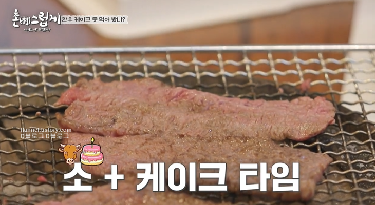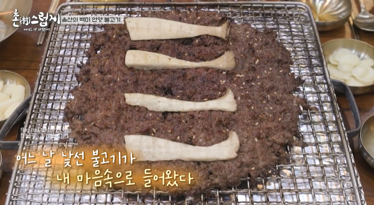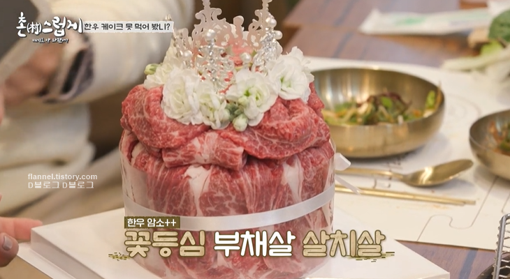 화로에 구워먹는 언양 불고기. 이틀 전 예약하면 암소 한우 투플러스 케이크도 받을 수 있음. 꽃등심, 부채살, 살치살로 만들어짐. 케이크 풀어서 화로에 구워먹음.