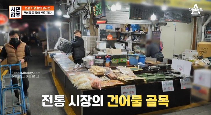 갑부는 감태를 가공하는 집집마다 들러서 완성품을 수거, 판매해요. 갑부 가게는 서산 전통 시장 건어물 골목에 위치하고 있어요. 감태, 김 뿐만 아니라 멸치, 뱅어포, 새우 등 다양한 건어물품을 판매하고 있네요. 즉석에서 구워주는 김이 판매량 1위고 감태는 신흥강자.