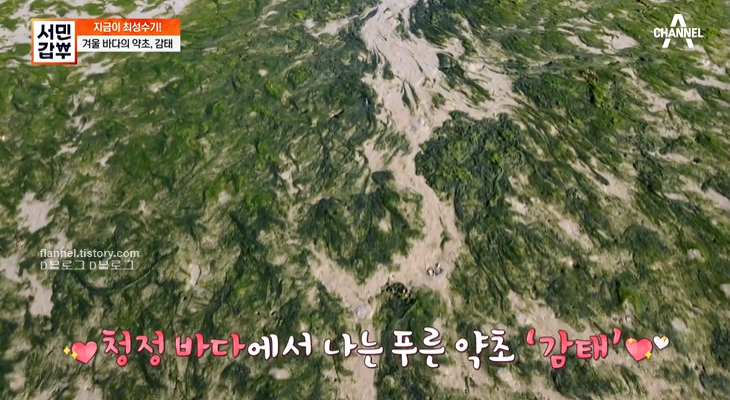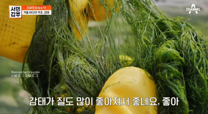 갑부는 충남 서산시 갯벌에서 감태를 채취해요. 감태는 청정 갯벌에서만 자라고 양식이 전혀 안 된다고 하네요. 갈조식물 다시마목 미역과의 해조로 전복의 주 먹이이며 12월에서 3월이 제철이에요.