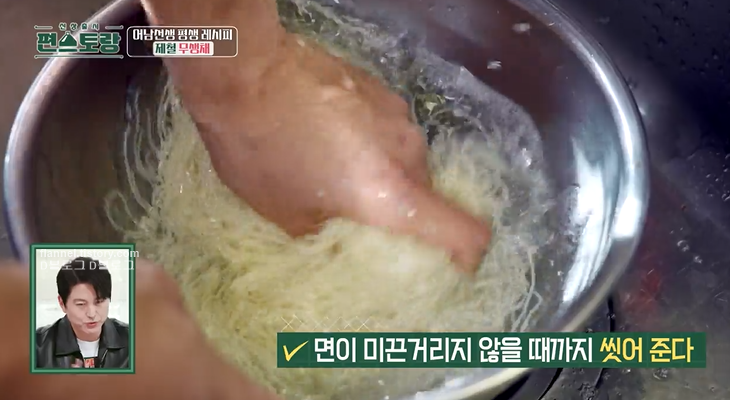 10. (무생채 비빔면) 소면 2분 삶고 찬물에 미끈거리지 않을 때까지 씻어주기