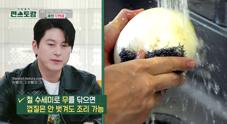 1. 철 수세미로 무 닦기 (철 수세미 사용하면 껍질 안 벗겨도 조리 가능)