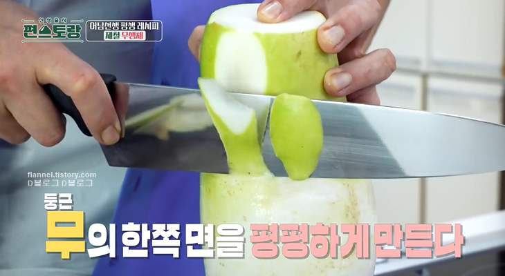 2. 무 한 쪽 면 평평하게 썰기 (무 고정)