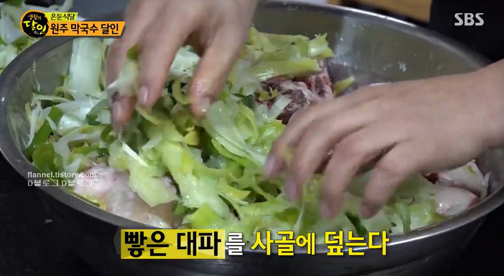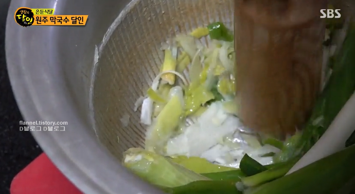 육수 주재료는 사골과 닭. 손질한 대파를 절구로 빻아 사용하더라고요. 이렇게 빻으면 대파에서 진액이 빠져나와 더 강렬한 감칠맛을 낸대요. 이후 사골에 덮어주기.