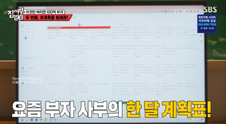 두 번째는 '무계획을 버려라'! 허투루 보내는 시간이 없도록 철저한 계획을 세운대요. 돈을 많이 벌려면 계획을 할 수밖에 없다는 것. 주언규는 어떤 곳에 가기 위한 이동시간도 계산해 놓고 3개월 뒤까지 빡빡하게 세워둔대요. 중요한 건 99% 계획을 실행한다는 것. 주말에는 계획만 세우고 주중에는 실행하고 직장인처럼 내가 시키는 걸 그대로 하면 쉽대요.