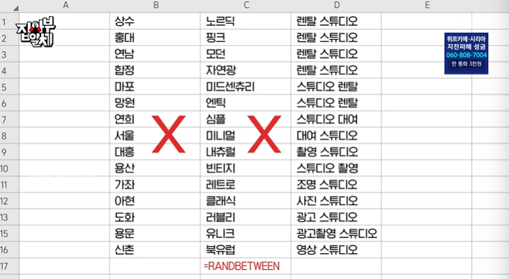 동업자와도 틀어져 절망할 때 마케팅 전문가를 만났고 키워드 광고 1만 개는 해야 한다는 조언을 들었대요. 그래서 10만 광고를 목표로 홍대 마포 등 위치 속성 리스트업, 자연광 핑크 모던 등 중간 수식어 리스트업, 스튜디오 렌털 스튜디오 렌탈 등 오타까지 수식어로 리스트업 했어요. 그리고 모든 속성을 엑셀 시트에 넣고 랜덤으로 섞으니 무려 30만 개 키워드 광고를 만들 수 있었다고 하네요.