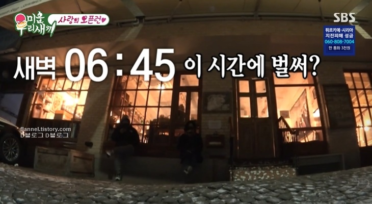 아무튼 세 사람은 새벽 6시 45분 빵집 앞에 도착했어요. 그런데 영하 15도 날씨인데도 벌써 사람들이 기다리고 있네요. 오픈 시간은 아침 8시인데 한 시간 전부터 기다려야 하나 봐요.