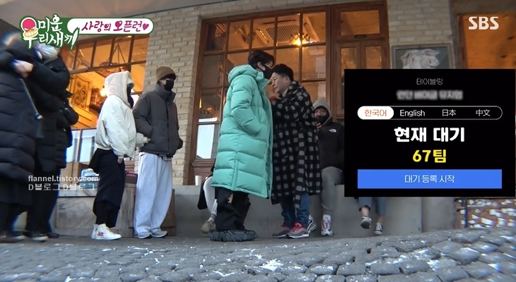 오픈 시간이 코 앞에 오자 벌써 67팀이 줄을 섰네요. 김준호는 김지민에게 전화해 오픈런했다고 자랑스러워하지만 김지민은 "참 노력한다" ㅋㅋㅋ