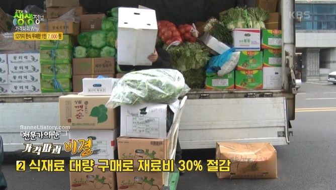 이렇게 가격이 저렴한 이유는 장부가 있기 때문. 고정된 거래처와 식사 계약을 해서 고정 수입을 확보할 수 있대요. 또한 식재료 대량 구매로 재료비를 30% 절감했어요. 또한 가족 운영으로 인건비를 절약하고, 저녁 시간엔 고기를 판매해서 이윤도 보충하네요.