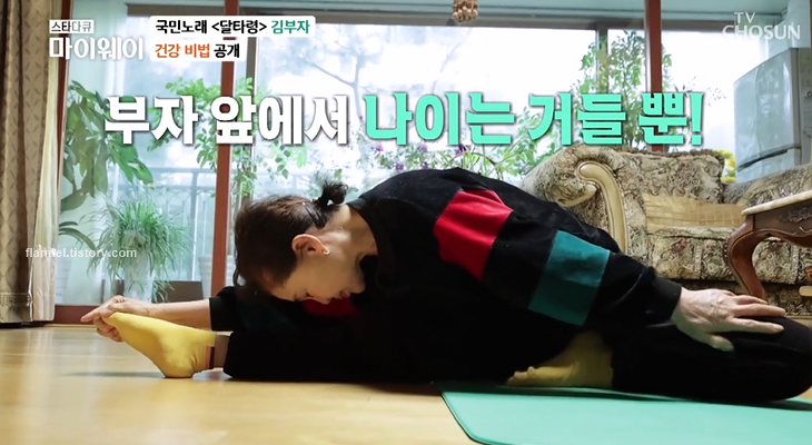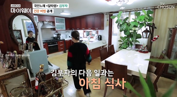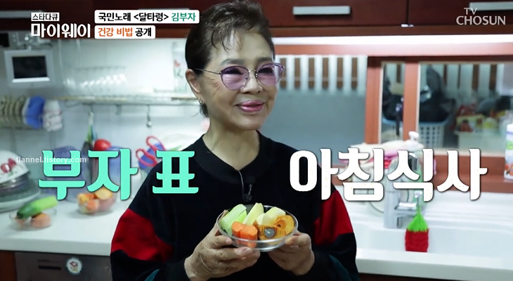 자신의 집도 공개한 김부자. 매일 아침 운동으로 하루를 시작한대요. 그래서 그런지 아픈데 없이 건강하게 살고 있다고 하네요. 아침 식사는 과일과 야채로 간단히 해결해요.