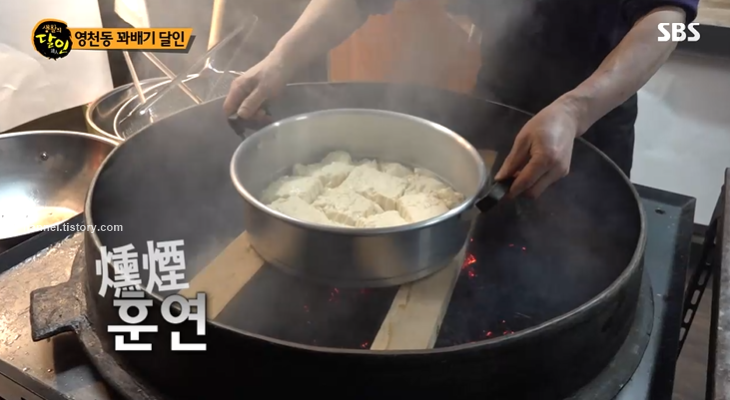 달인의 꽈배기가 끝까지 쓴 맛없이 고소한 이유는 연두부에 있어요. 연두부에 공개 불가 재료를 바른다네요. 가마솥에는 솔방울을 넣고 활활 태워 연기가 나면 뚜껑을 닫아요. 그리고 연두부를 훈연하기. 향긋한 솔방울 향이 연두부에 더해진대요.
