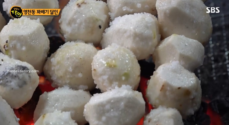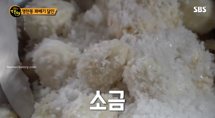 신기한 건 달인의 꽈배기는 시간이 지나도 바삭함이 유지된대요. 그 바삭함의 비결은 바로 토란에 있었네요. 토란에 소금을 묻히면 소금 간도 되고 구울 때도 잘 구워진대요. 이후 유채나물 우려낸 물에 삶아주기.
