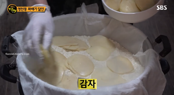 두 번의 꼼꼼한 냄새 제거 후 위에 또 한 번 감자가 얹어지네요. 전분이 두부에 스며들어서 쫄깃거리고 쭉 늘어난대요.