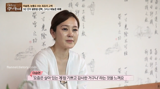 이승연은 위안부 누드 사건을 비롯해 프로포폴 투약으로 큰 사회적 논란이 있었어요. 이후 이승연은 한 방송에 출연해 당시 자신이 너무 달렸기에 몸과 마음이 많이 아팠다며 뒤늦은 후회를 했죠. 스스로 홀대한 벌은 받는구나 생각했대요.