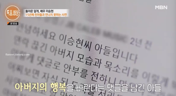 이에 제작진은 아들을 찾아 나섰어요. 아들은 돈가스 가게를 하며 일요일엔 음악 학원을 나온다고 하네요. 제작진과 통화가 됐지만 당장은 아버지를 만나고 싶지 않다는 아들. 이승현이 이혼을 할 수밖에 없었던 가장 큰 이유는 돈이 안 되는 연기자의 길을 끝까지 고집했기 때문이래요.