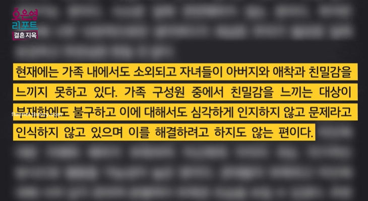 남편에게 서운한 일이 또 있었는데, 둘째 아들이 장애가 있다는 걸 알고 담임교사가 책임지기 싫어 전학 가라고 했었대요. 아내가 싫다고 하니까 학교 밖에서 일어난 사고에 대해 학교 책임을 묻지 않겠다는 각서를 썼대요. 그때도 남편은 나서지 않고 집에만 있었다고 하네요. 아내는 각서 때문에 매일 아침 아이들 등교를 시켰대요.
