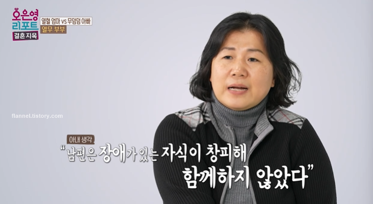 둘째 아들은 지적 장애 3급이에요. 둘째 아들 장애 판정 이후 부부는 정말 힘든 시간을 보냈다고 하네요. 첫째 아들은 일반 학교를 다녔는데 선생님도 케어가 어려워 아내가 교실 문 밖에 앉아 지키고 있었대요. 소풍도 따라가고 치료를 위해 인천까지 매주 다녔대요. 하지만 남편은 치료 다녀와도 어땠냐는 말 한마디, 이런 걸 해보자는 말 한마디 없이 무관심했대요.