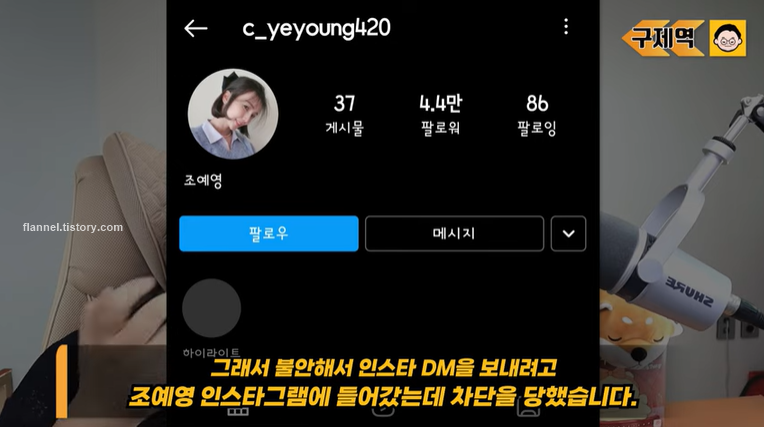 구제역은 이후 유튜브 커뮤니티를 통해 제보를 받는다는 글을 올린 바 있어요. 그랬더니 조예영에게 바로 전화가 왔대요. 글을 내려달라고 요청한 것. 구제역은 돈 받고 인스타 차단했냐고 물었지만, 조예영은 차단한 게 아니라며 오해가 있었다고 해명했어요.