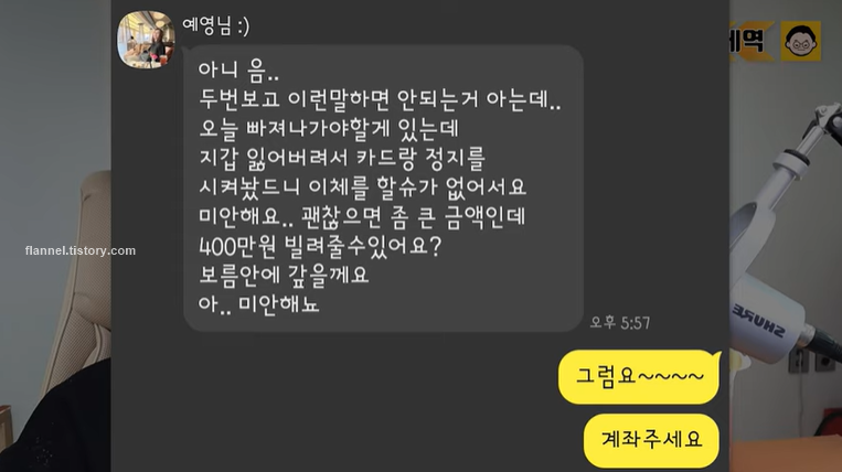 그리고 실제 두 사람은 만나서 차 한 잔도 했다고 해요. 며칠 뒤 또 만나서 밥도 먹었대요. 그리고 두 번째 모임 다음날 조예영이 뜬금없이 팬에게 카톡을 보내 400만 원을 빌려달라고 했대요.